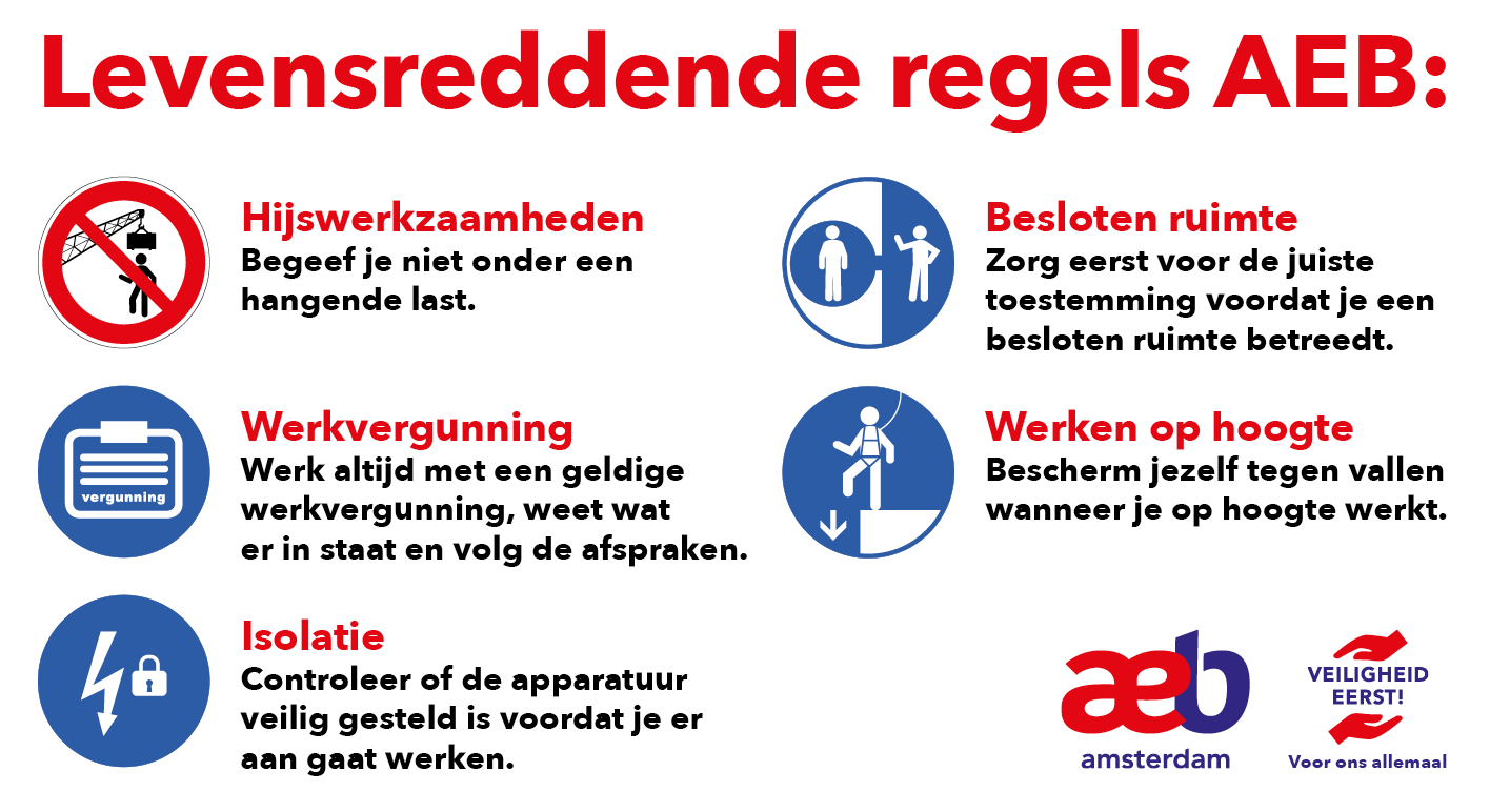 Bij AEB Amsterdam wordt veilig gewerkt. Op deze pagina staan de veiligheidsregels die bij AEB gelden voor verschillende type werkzaamheden. Medewerkers van bedrijven die bij AEB aan het werk gaan, moeten in het bezit te zijn van een geldig identiteitsbewijs (Paspoort, ID-kaart of tewerkstellingsvergunning). Daarnaast is een geldig VCA-certificaat nodig.